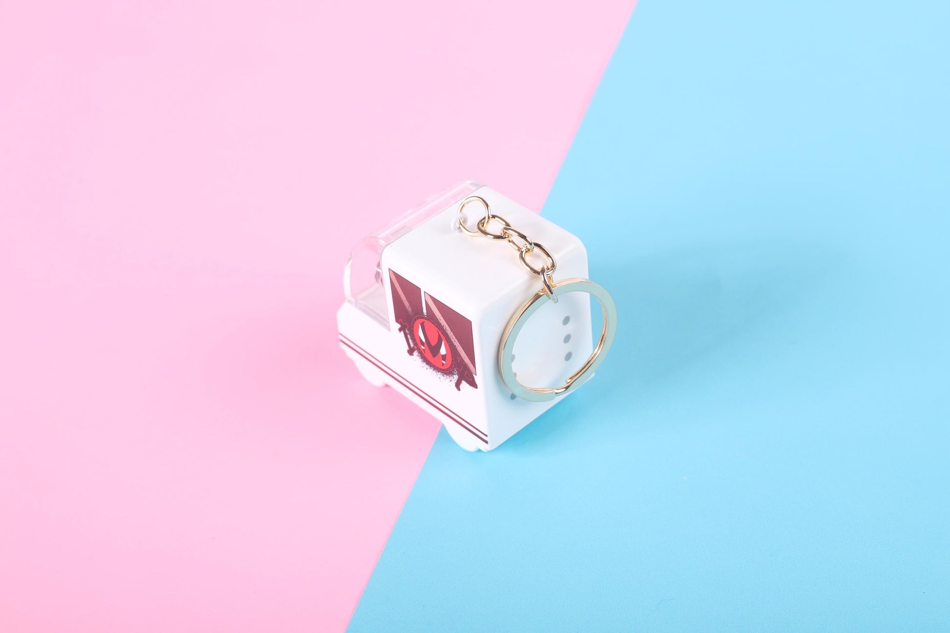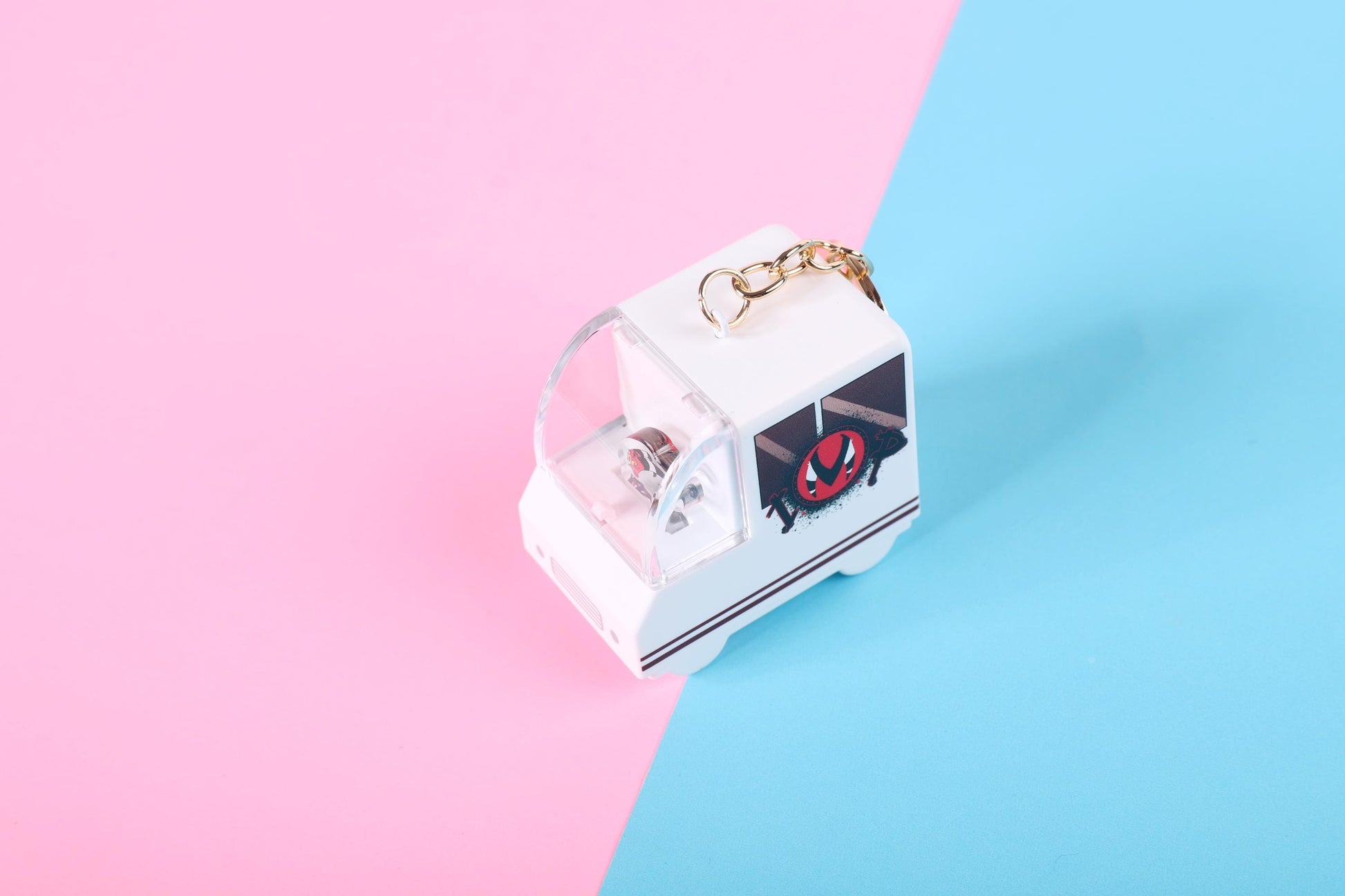 A 4 inch keychain of Blitz driving his IMP branded van from Helluva Boss. Each keychain is printed on both sides and has a small acrylic Blitz in the front.