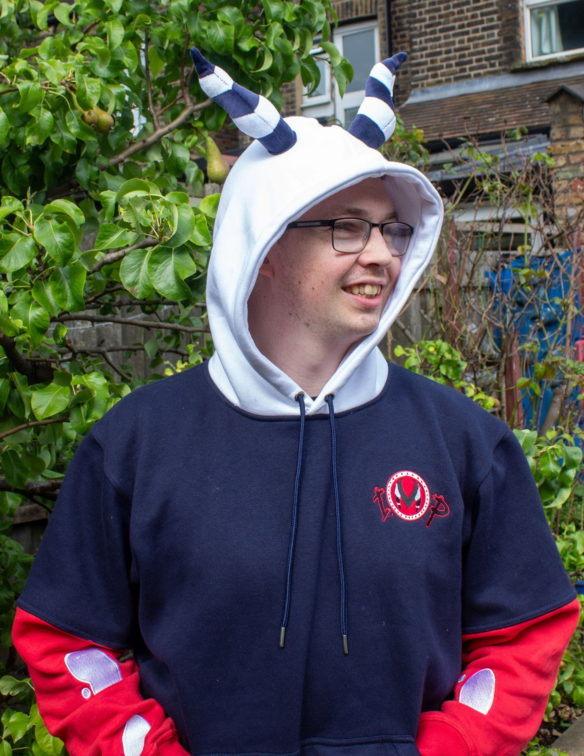 Helluva Boss Moxxie Plush Horned Hoodie with IMP Logo | Soft Pull Over Hoodie with Embroidery