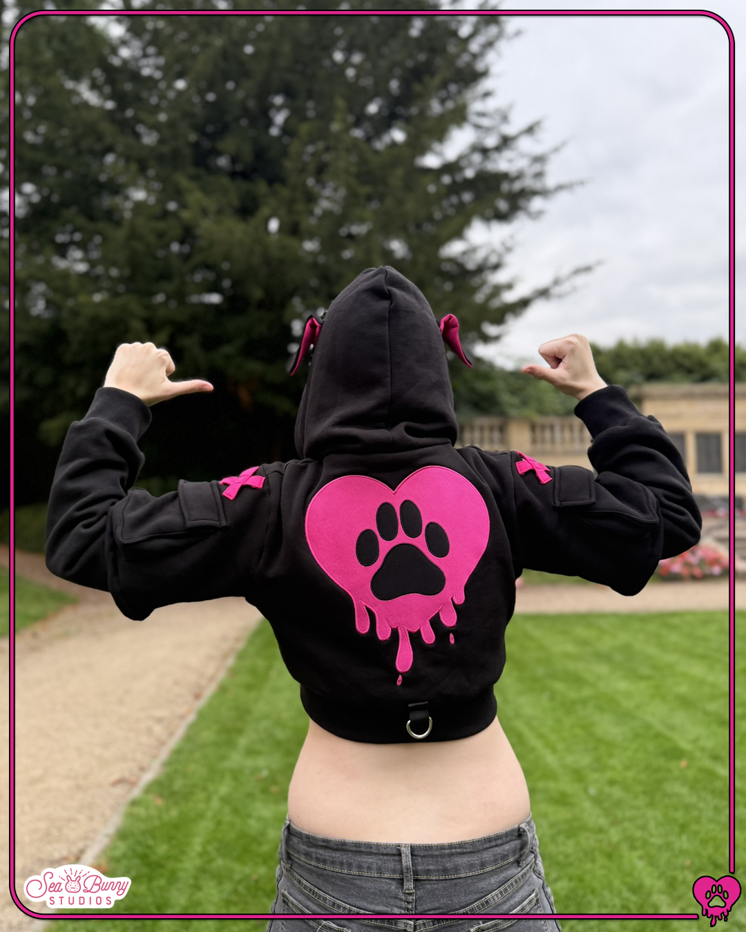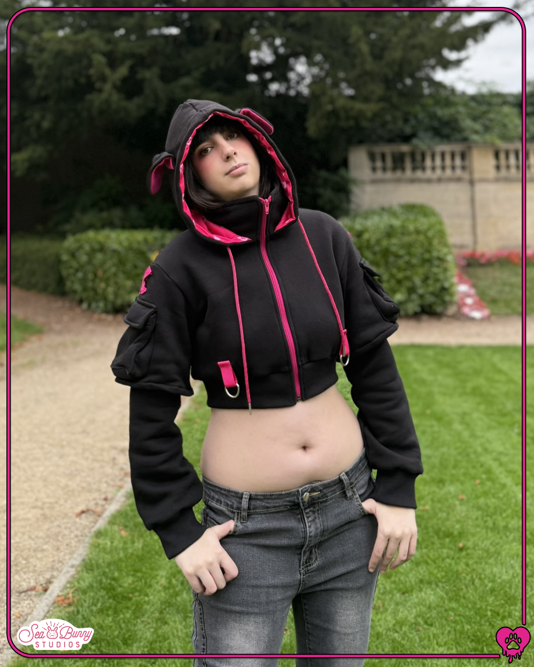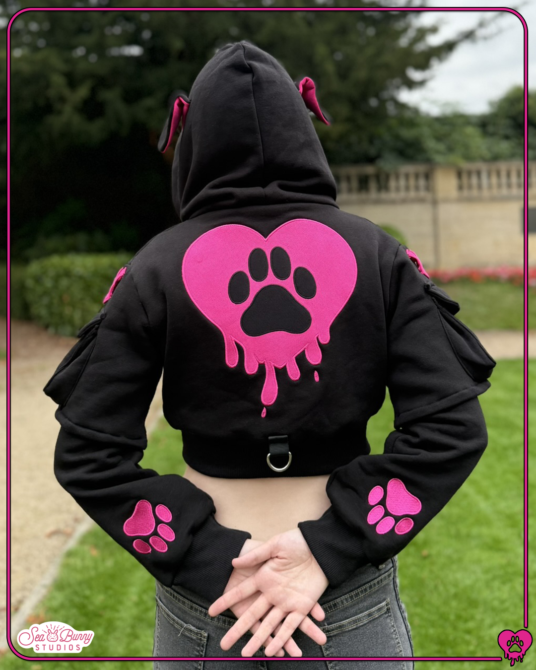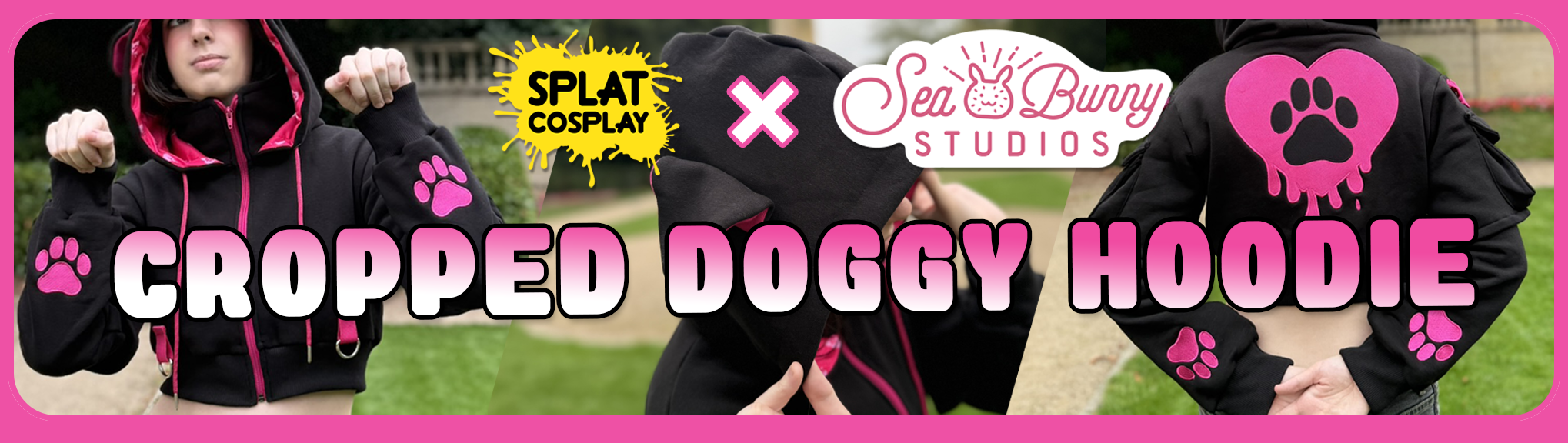 Woof woof! Back at it again with more canine themed attire, Seabunny Studios is here to bring you the all new cropped doggy hoodie! Debuting in a stylish hot pink and black colour way, the hoodie is more of what you love from previous designs, along with a few new extra elements!